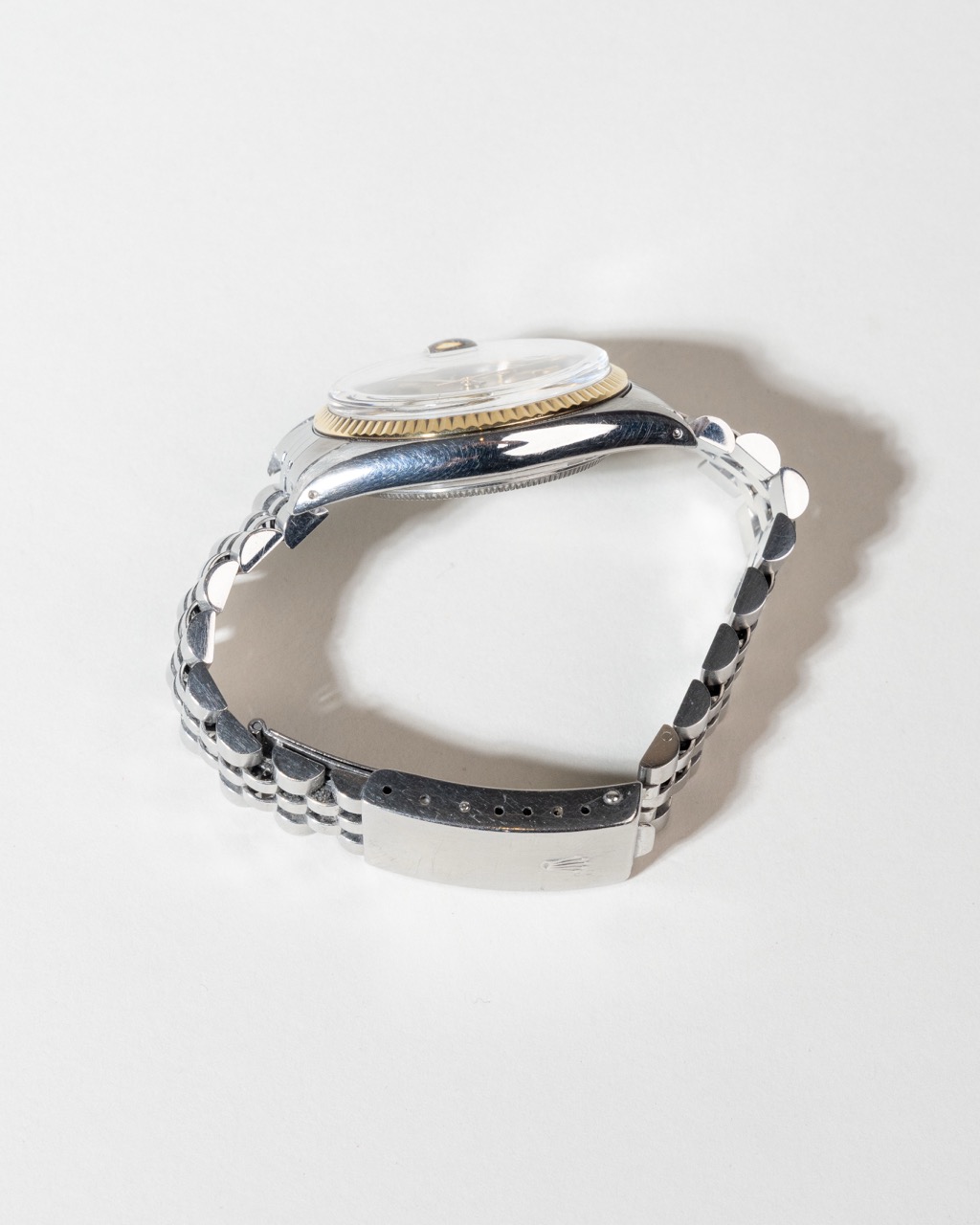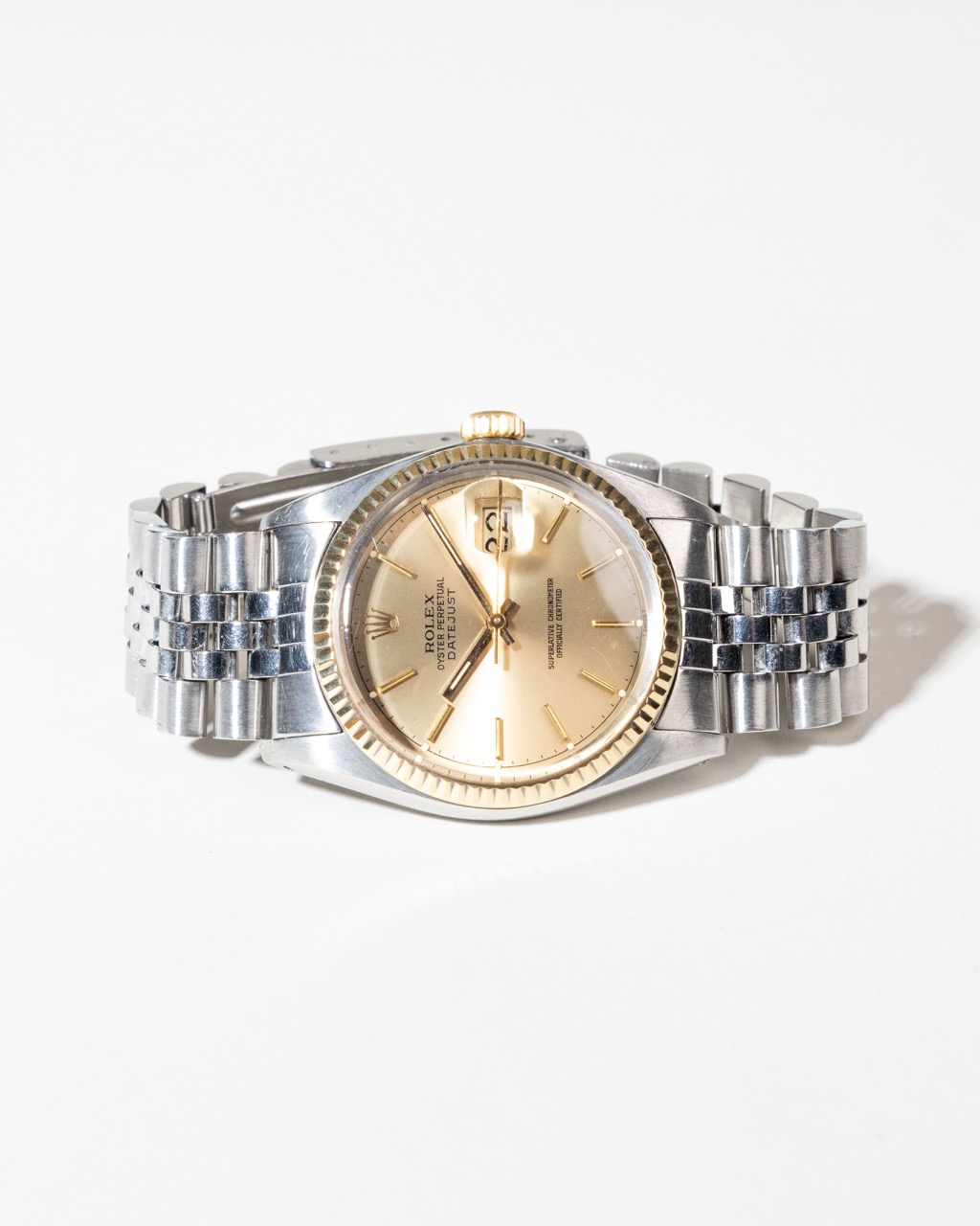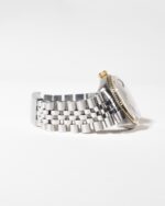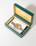 En klassisk og eftertragtet Rolex Datejust i Rolesor, kombinationen af stål og 14 kt gult guld. Modellen har en varm champagnefarvet skive med slanke guldtone-markeringer og datovisning under den ikoniske Cyclops-linse. Den riflede guldbezel giver et eksklusivt udtryk, mens Jubilee-lænken fuldender det tidløse design. Uret drives af det pålidelige automatiske Calibre 3035, kendt for sin præcision og holdbarhed. Et perfekt valg for samlere og entusiaster, der ønsker et ægte vintage Rolex med klassisk karakter.