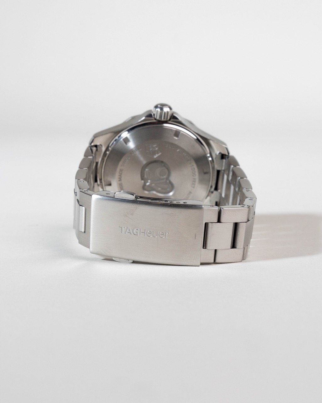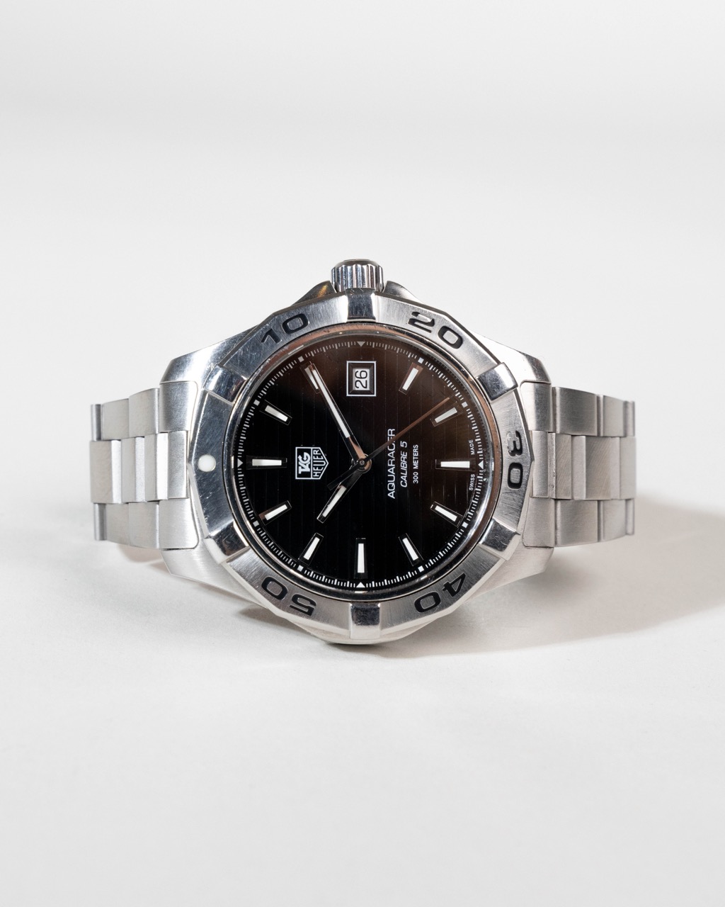 Et robust og sporty dykkerur fra TAG Heuers populære Aquaracer-serie. Modellen har en sort stribet skive med datovisning og kraftige lume-markeringer, hvilket sikrer høj læsbarhed under alle forhold. Den drejelige dykkerbezel og stålkassen understreger det funktionelle design, mens det automatiske Calibre 5-værk leverer pålidelig præcision. Med stållænke og 300 meters vandtæthed er dette et ideelt valg til både hverdag og eventyr under vandets overflade.